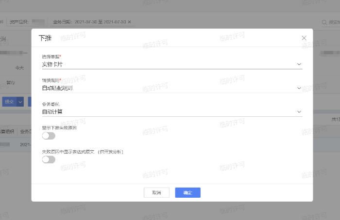步骤4:在采购转固单新增直接点击下推按钮,或列表页面选中“已审核”状态的采购转固单后点击“下推”按钮,在弹出的对话框中确认生成规则,点击确认,可以按数量拆分批量生成实物卡片。