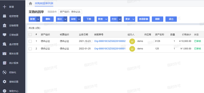 步骤1:在固定资产菜单栏点击“实物管理—采购转固单”进入采购转固单列表。