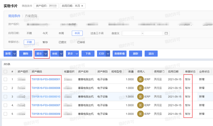 步骤6:实物卡片审核完成后,系统会自动生成一个与该实物卡片相对应的单据状态为“暂存”的财务卡片(多账簿平行折旧的情况下系统会在该核算组织的各资产账簿中各生成一个与该实物卡片相对应的单据状态为“暂存”的财务卡片)。在财务卡片列表页面可对“暂存”状态的财务卡片进行提交和审核。