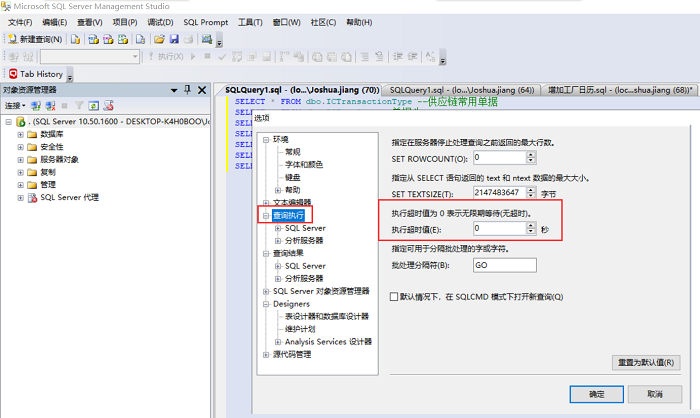检查一下数据库的配置情况,工具-选项-查询执行里看一下图示参数