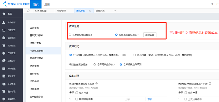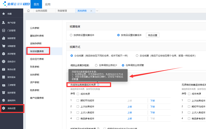 云星辰系统存货成本参数设置