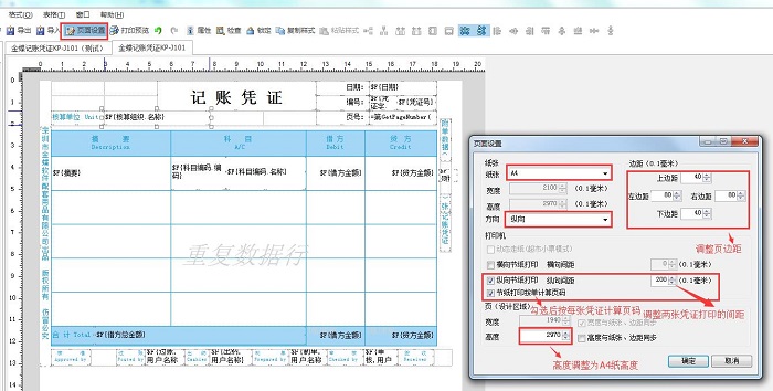 5)页{设计区域}高度调整为A4纸高度,点击【确定】后再点击【保存】,模板设置完成; (注:【页面设置】中需勾选“节纸打印按单计算页码”,例如,选择10张凭证,每张凭证只有1页,则勾选此参数后每页页码为1/1,若不勾选则为1/10、2/10······)