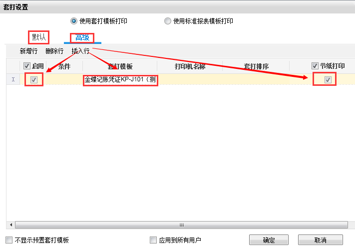 2、除了在BOS凭证模板【页面设置】中需要勾选“纵向节纸打印”,还需要在凭证查询界面【选项】下【套打设置】高级页签里勾选“启用”和“节纸打印”,此时模板才能生效。