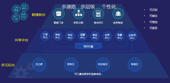 它包含了传统的B2C电商管理,B2B多层级与深度营销管理、零售连锁管理,以及围绕连接之后供应链体系的构建(如O2O整合管理、智能的要补货管理、门店协同管理、全局库存管理等)与共赢机制的构建(如全网会员管理、促销管理、返利管理、客户资金池管理等),实现全网订单统一管理,全局库存统一分配,全网会员精准营销,以及业财融合的一体化解决方案;