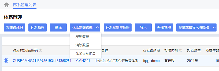 (1) 点击【合并报表】/【财务报表】->【体系管理】->【复制数据】可以对体系的多维数据库进行复制操作,该操作直接针对数据库数据进行更改,不会生成分录记录,复制成功后,目标的维度组合会出现数据。