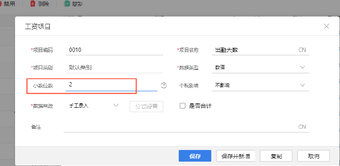 2)工资项目的小数位数规则是:内置的工资项目,默认取本位币币别中的金额精度;新增的数值型工资项目,小数位数可以自定义,支持录入0-10位精度。