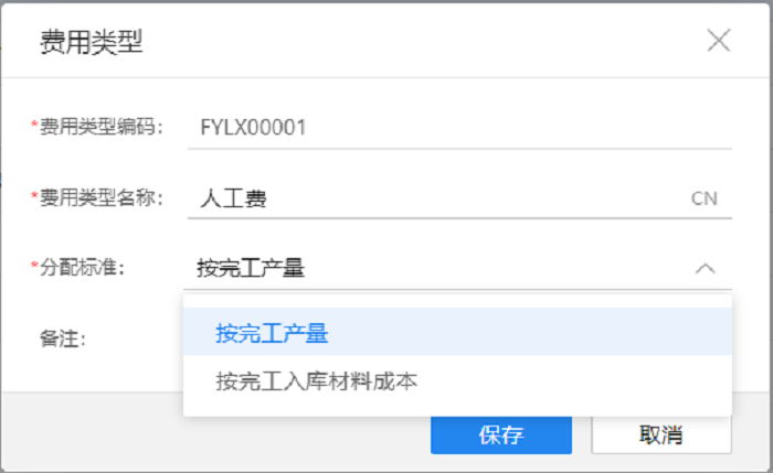 【答】:点击费用类型编码进入编辑界面修改分配标准保存即可。系统目前预置了2种分配方式支持选择:按完工产量/按完工入库材料成本。
