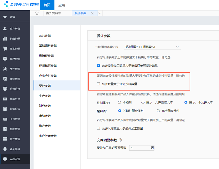 【答】:通过参数设置控制。在系统设置-委外参数中,不勾选“允许数量大于计划投料数量” 即可。