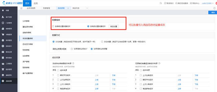 2)按商品设置核算成本:选择此参数,则取商品中设置的计价方法进行出库成本核算。每种商品均可以设置 不同的计价方法。