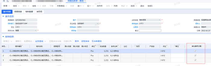 其他出库单,领料部门选择基本生产属性时,单据体默认勾选:参加费用分配。