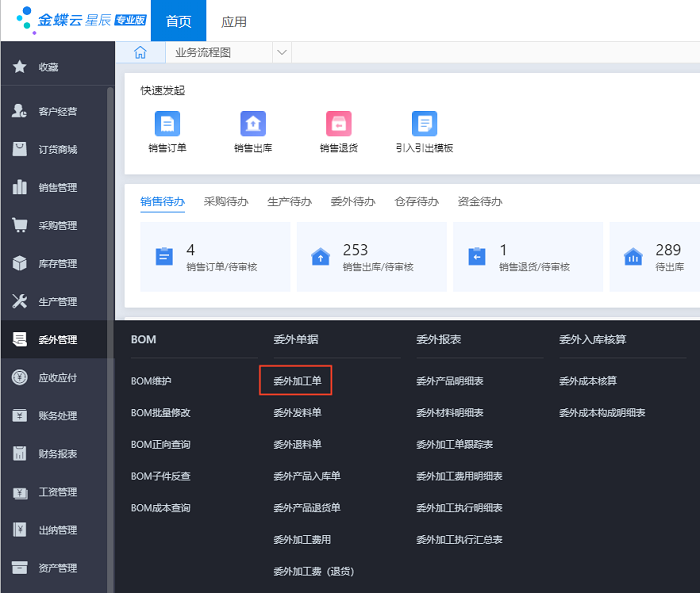 企业因自身产能或技术等原因无法满足生产需求,需要委托供应商进行加工,将产品进行委外加工时,明确加工的产品及材料、数量以及加工的费用,可通过委外加工单处理。