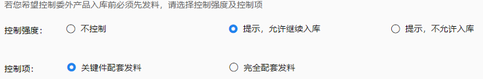 • 应用流程:与[系统参数-委外参数-入库前必须先发料]配合使用。在BOM子项中维护关键件或在委外加工单的材料信息中维护关键件,则可以根据参数中设置的控制强度对单据进行控制。如控制强度选择:提示,允许继续入库;控制项选择:关键件配套发料。则当关键件没有配套发料时,委外加工单入库保存时会进行提示:入库数量大于关键件发料套数,若点击继续,则可以保存。