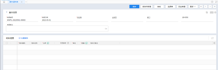 单据编号:可根据编码规则自动生成单据编号,由编码规则指定是否允许编辑