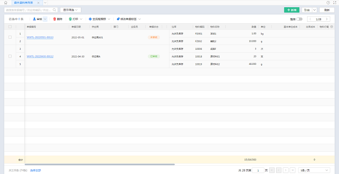 供应商在加工过程中发现材质量不合格,需要退回给企业并要求重新提供合格可用的材料。或者加工完成后,有剩余材料退回给企业。仓管员接收到供应商退回的材料后,可以通过委外发料单列表的“退料”按钮生成委外退料单,将退回的材料入库。也可以在【委外管理】→【委外单据】中新增【委外退料单】,【选源单】选到对应的发料单生成委外退料单。