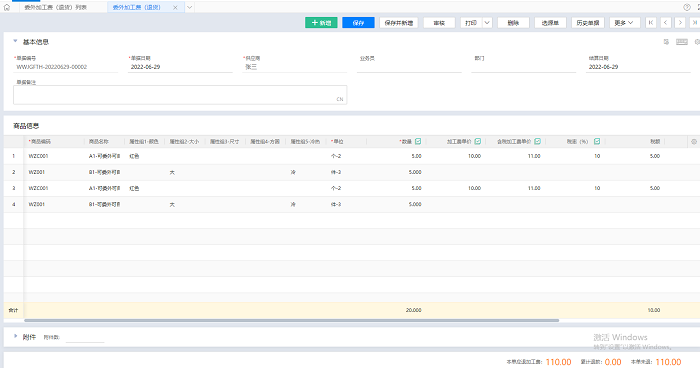2、新增:新增委外加工费(退货),跳转到委外加工费(退货)录入界面