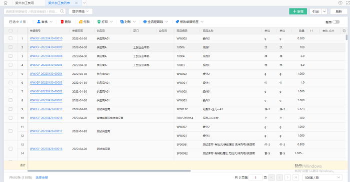 选择具体的委外加工费(退货)(支持多选)后,根据弹出的操作按钮,支持: