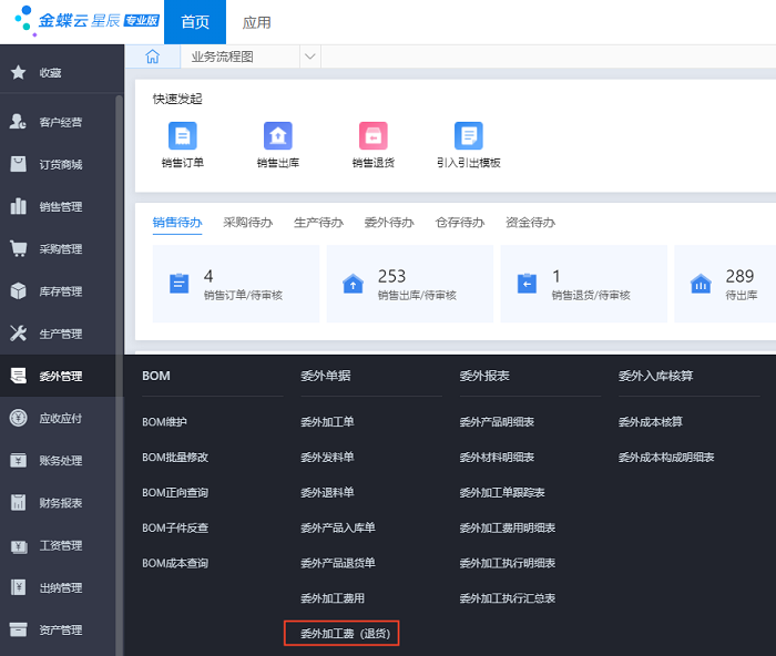 金蝶云星辰委外加工费(退货)应用场景