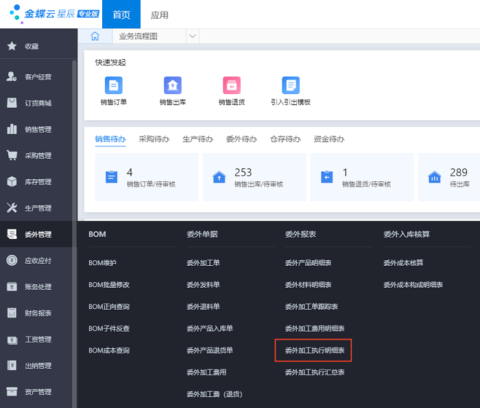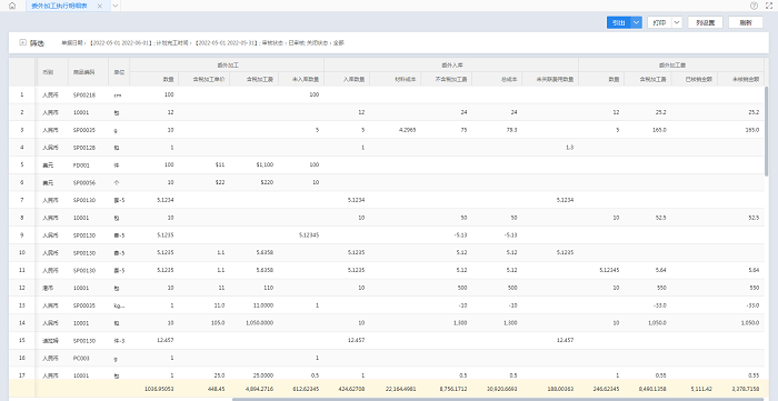 委外加工执行明细表是根据当前过滤条件,展示每一张委外加工单的执行情况,方便了解一段时间内委外加工单的入库数据、成本数据、加工费用及其核销数据。支持按单查看委外入库成本(含材料成本和费用)、产品入库对应的委外加工费用以及费用的已付款金额等信息。