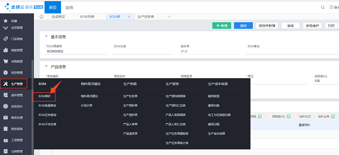 在BOM单据页面或BOM列表页面,选择一张BOM单,点击【多级维护】按钮,即可进入BOM多级维护功能。该功能为左树右单结构,左边的树形图展示了BOM单的多级结构,右边的单据页面支持对树节点上的产成品或半成品的BOM单进行新增、修改、审核、反审核的操作。