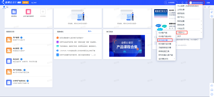 首先使用浏览器访问金蝶云星空站点,点击右上角的用户名,在下拉列表中的下载中心里点击BOS设计器即可进行下载。