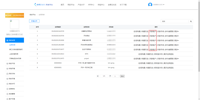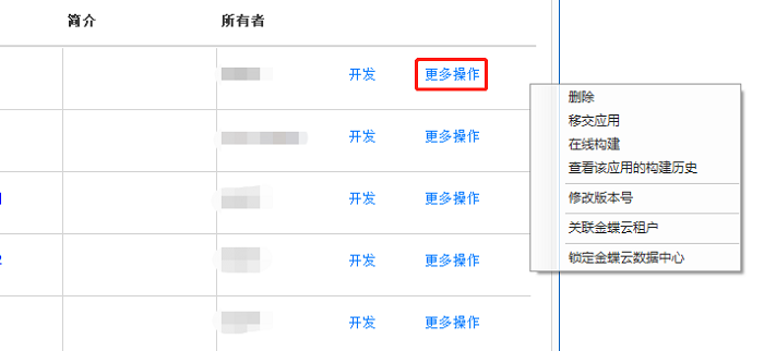 在应用管理找到“更多操作”,选中关联金蝶云租户,会直接链接到相关网址。