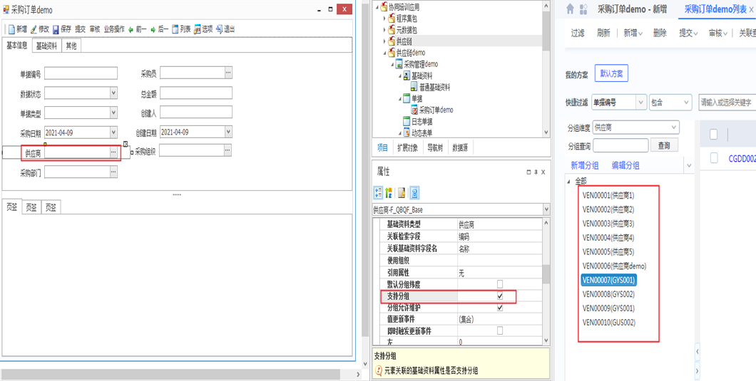 勾选支持分组属性后,单据列表展示就会根据供应商分组展示。