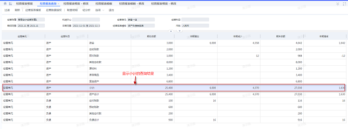 使用的是我们预置的资产负债类报表模板,修改维度项勾选显示小计,报表查询的结果如下: