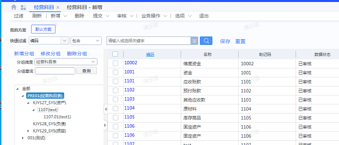 存放经营科目的一个经营科目的层次结构。系统预置了三种类别(资产、负债、损益)的科目。而且科目支持多层级展示。