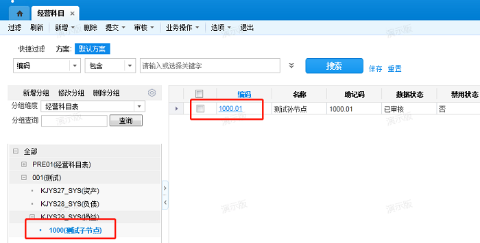 - 把1000.01的其他的信息补全点击保存。再返回列表页面的查看层级结构(需要关掉列表界面重新打开加载层级结构)如下图所示:测试子节点也变成了层级结构的一个节点,点击测试子节点会显示该层级下所有属于测试子节点的所有下级科目。