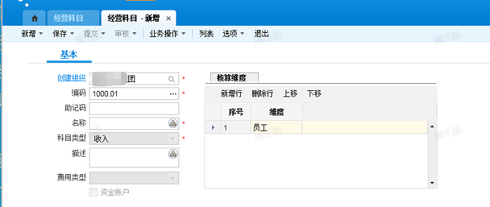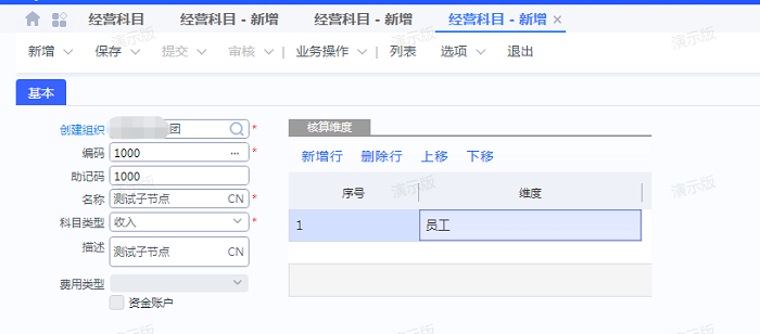 在测试的科目表下添加一个科目类型为收入的科目,核算维度设置成员工。如下图