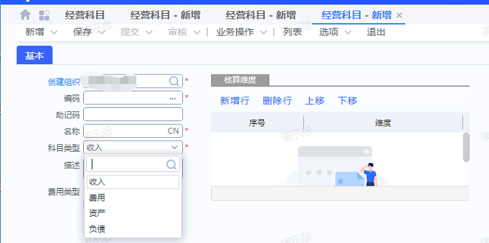 - 费用类型: 变动费用和固定费用。这个选项只有科目类型选中费用时才可选,其他状态是锁定不可选状态。