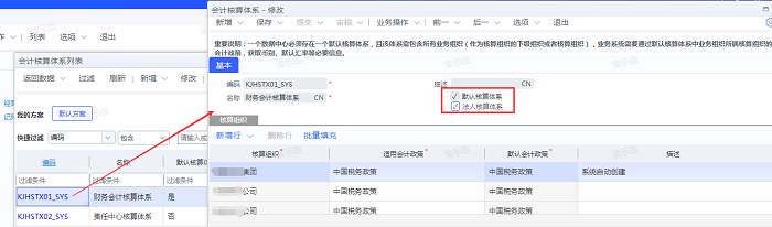 • 点开财务会计核算体系,能看到勾选了法人核算体系和默认核算体系。