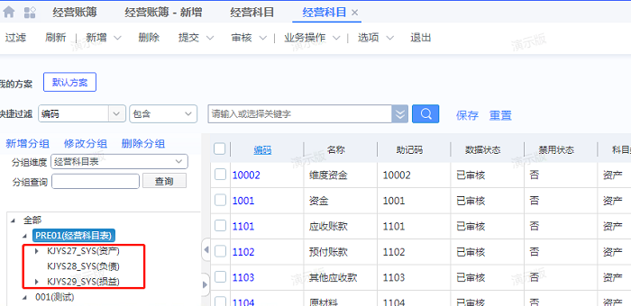 • 经营科目表:存放经营科目的一个经营科目的层次结构。系统预置了三种类别(资产、负债、损益)的科目。而且科目支持多层级展示。