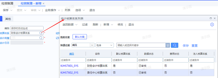 • 核算体系:会计核算体系是对企业核算范围和口径的标准划分,企业可以根据管理需求不同划分多个核算体系,可以进行财务会计核算,也可以进行责任中心考核。
