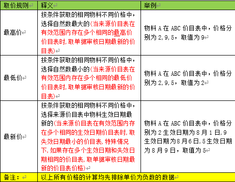 - 取价规则:可选值为最低价、最高价、最新价,规定物料价格的获取规则,具体详细规则如下表1.1。