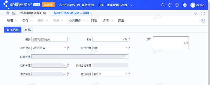 - 物料来源:若价格对象为物料时,则可选,否则锁定