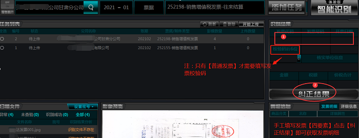 可以在财务机器人右上角手工填写或修改【发票四要素】后点击【纠正结果】进行发票信息获取