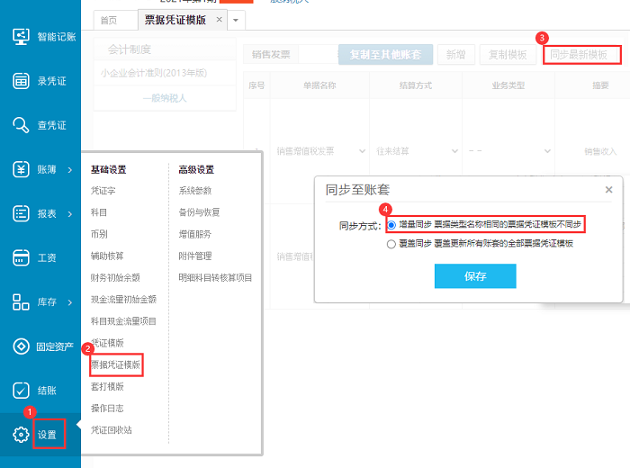 1、打开【设置】 -- 【票据凭证模板】 -- 检查各个发票类型下是否都没有模板,如果确定都没有,则点右上角【同步最新模板】 -- 【增量同步】