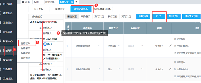 2、如按照以上操作后还是没有,可打开未进账簿前的界面 --【智能财税】 -- 【智能记账】 -- 【票据凭证模板】 -- 选择对应制度和纳税性质,是否也没有模板,若是没有,可点击右上角新增模板,然后重新进账簿,按照步骤1进行操作