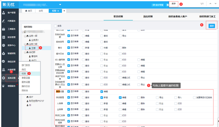 在管家界面,打开【系统设置】 -- 【权限】 -- 【职员权限】 -- 鼠标点击该职员,可用快捷键CTRL+F查找到库存管理几个模块是否勾选,如果未勾选,则需要管理员进行授权后才可操作。(如果未找到这个权限设置模块,可以找管理员授权开通)