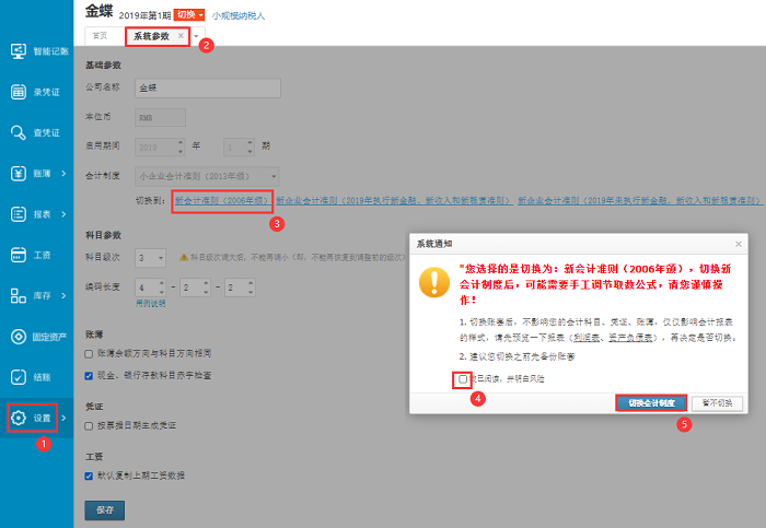 先查看当前会计准则,如果不是对应的会计制度可以切换,点击【设置】→【系统参数】→【新会计准则2006年版】勾选我已阅读,完成切换制度操作。