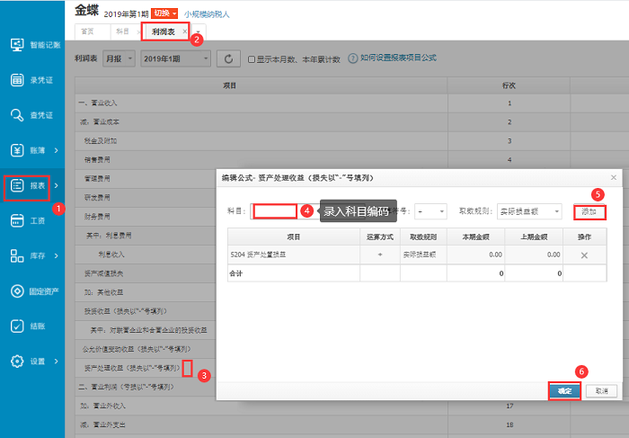 点击【报表】→【利润表】→【资产处理收益】项目旁的笔状按钮,编辑公式界面录入对应的科目编码,点击【添加】→【确定】完成添加即可。