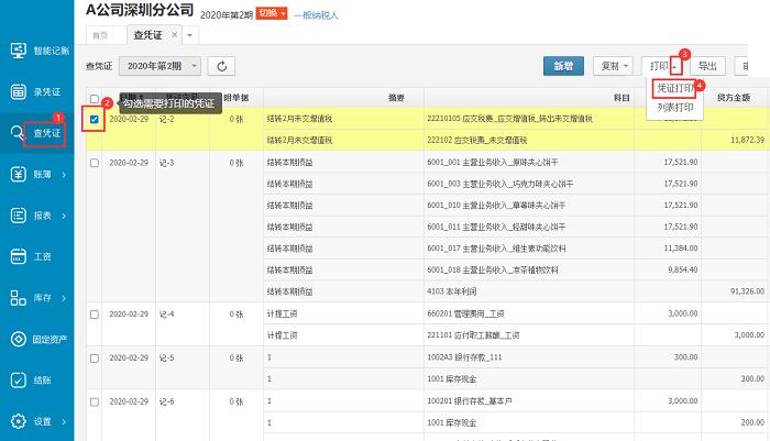 1.在【查凭证】界面 -- 选择需要打印的凭证点击【打印】 -- 【凭证打印】;