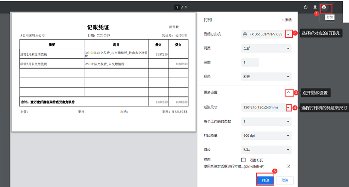3.进入打印预览界面后,鼠标移到右上角点击打印机图标,点开更多设置,纸张尺寸选择对应打印机纸张120*240进行打印。