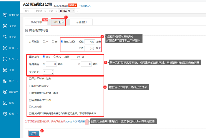2.选【PDF打印】 -- 【自定义纸张】-短边输120,长边输240,设置好后点击打印 ;