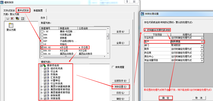 举例:比如客户01金蝶国际,02也是金蝶国际,下发之后在分公司帐套后只能看到01金蝶国际,02金蝶国际看不到。这时候在冲突设置界面,勾选【仅判断并处理代码冲突】参数,选择【强制覆盖】即可成功下发。