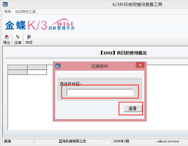 2、将下载的压缩包解压后在文件夹中的“K/3科目使用情况查看工具.exe”,右键选择【以管理员身份运行】,输入用户名密码之后进入工具主界面后,输入科目然后单击【查看】按钮即可显示使用情况,根据使用情况去删除修改已被使用的记录。