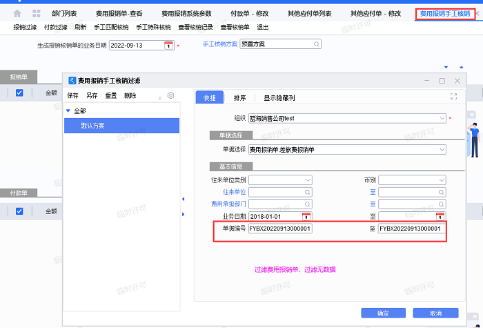 5、费用报销手工核销无法过滤费用报销单FYBX20220913000001和付款单FKD000000652022.09.13(已核销,但是核销记录异常)