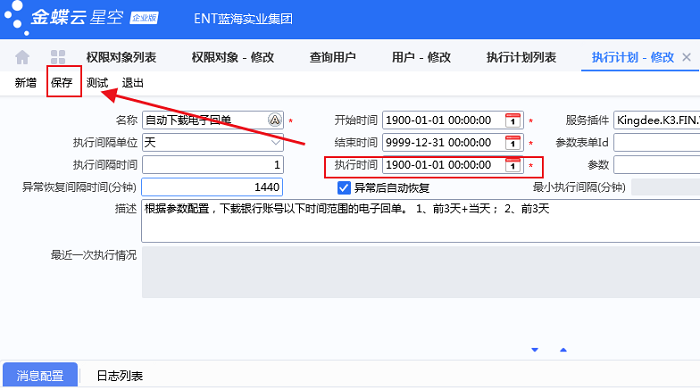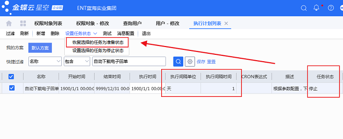 1、使用administrator登陆星空,【基础管理】-【公共设置】-【执行计划列表】中,搜索名称为 “自动下载电子回单”,查看任务状态是否为“准备”,若是停止状态,可点击菜单栏“设置任务状态”-“恢复选择的任务为准备状态”,打开该执行任务,看下“执行时间” 是否为下一个时间,可手工修改。系统默认执行时间间隔为 每天执行1次,下载银行账号前3天+当天的记录,若时间更前面的,需要手工下载。