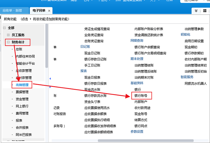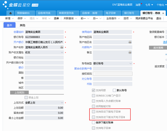2、 其次普通用户 登陆星空,【财务会计】-【出纳管理】-【银行账号】,打开对应账号,勾选参数“支持自动下载电子回单”、“支持自动下载当天电子回单”。
